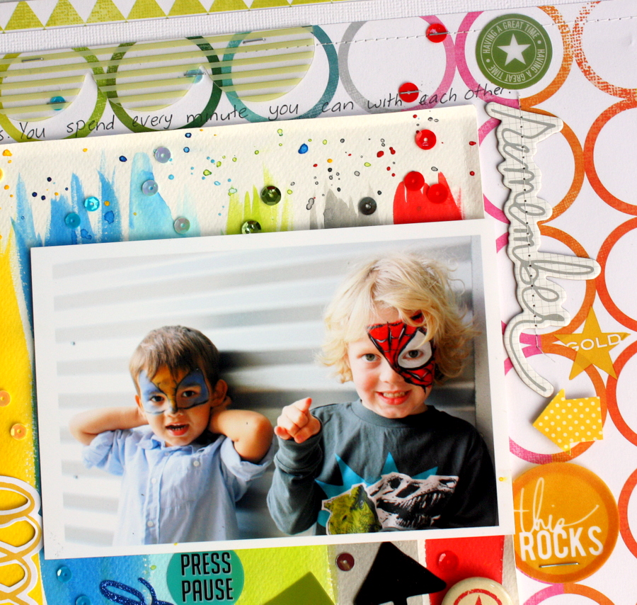 I used some water colour paper and watered down water colour to create my messy stripes. I picked up the colours that were in my photos for the coloured stripes. I then grabbed some Heidi Swapp Ephemera pieces in coordinating colours to embellish under my photo.