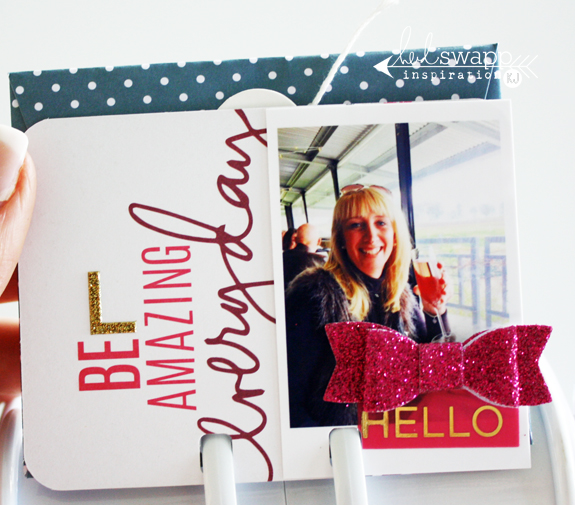 Here I layered washi tape, a puffy sticker and the Project Life Gold Phrase sticker at the top of the card, clipped together with the gold clip.