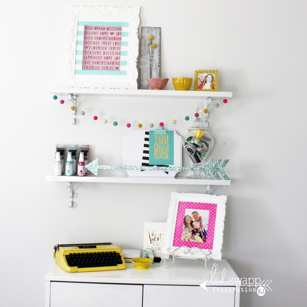 Have you heard ? Heidi Swapp will be releasing a brand new and way over the top incredible Home Decor Gallery Wall collection exclusive to Micheal's in the coming weeks. I am so honoured to share some of the pieces with you today and share how I restyled one of the walls in my craft studio. Lets start with the over all picture of my new shelving area. Isn't it just the prettiest.